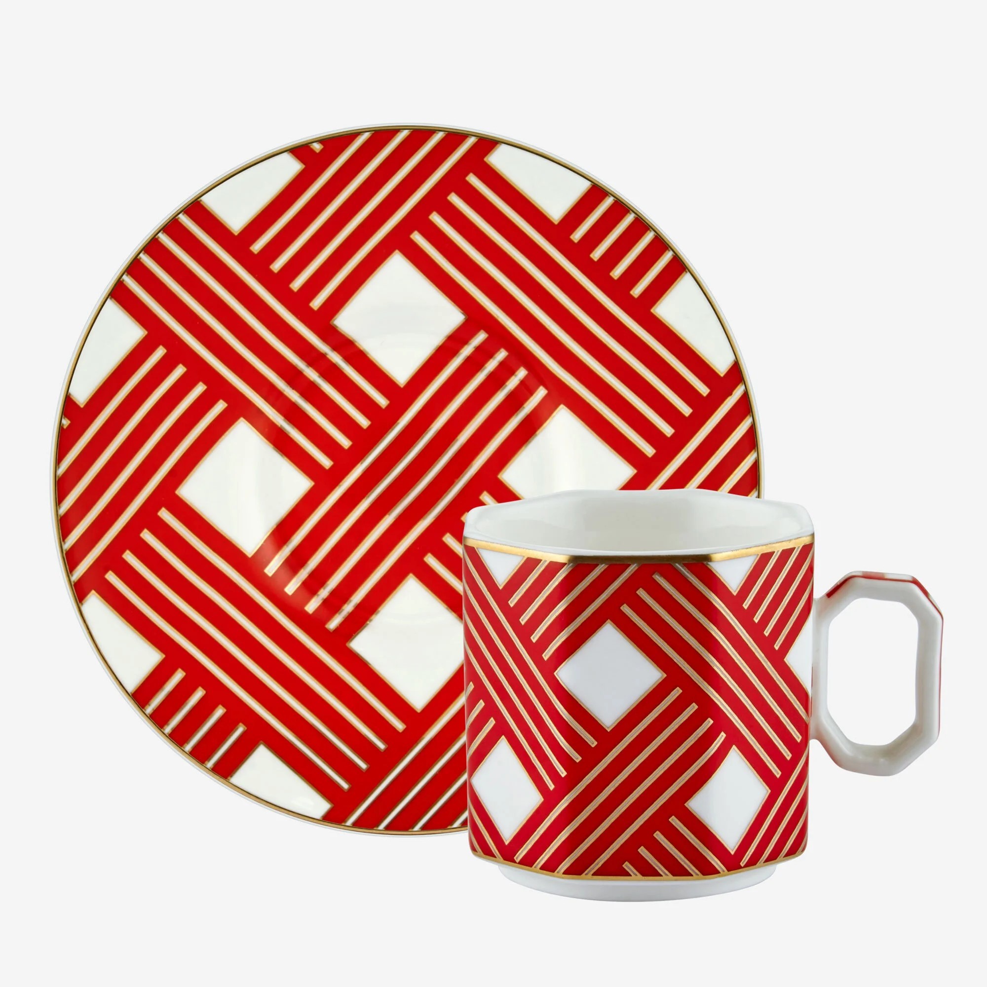 Zamansız şıklığı modern çizgilerle buluşturan Chiara Alessi 2’li kahve fincan seti, cesur geometrik deseni ve göz alıcı kırmızı-beyaz kontrastı ile dikkat çekiyor. Altın yaldız detaylarla zenginleştirilen bu özel tasarım, her kahve sunumunu bir sanat eserine dönüştürüyor.