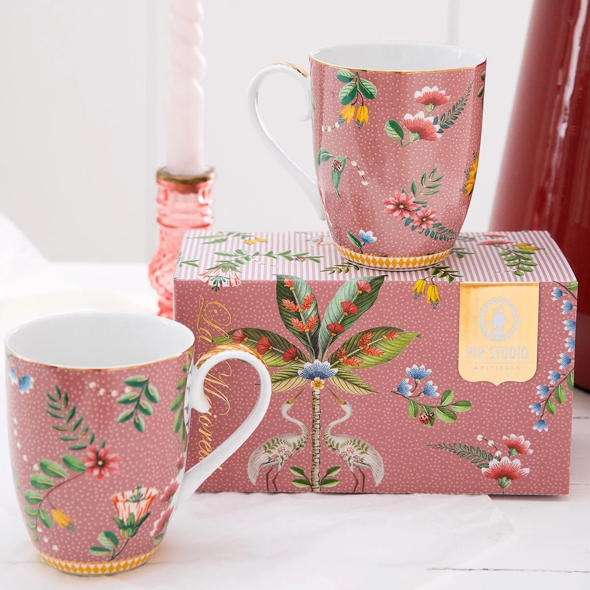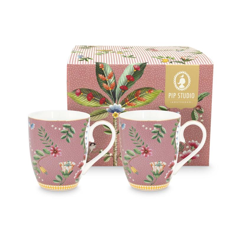 Bulunduğu ortama lüks bir hava katan Pip Studio La majorelle ikili mug seti, ihtişamıyla ön plana çıkmayı başarıyor. Pip Studio La Majorelle kupa seti unutulmayan anların en özel eşlikçisi olmaya aday. Kupalar, sıcak pembe bir arka plan üzerinde neşeli La Majorelle tasarımıyla dekore edilen bu tasarım, farklı egzotik çiçek çeşitlerine sahip küçük stilize çiçek dallarına ve kupaların alt kısmı, kupalara lüks bir görünüm ve his veren sarı elmaslarla süslenmiş beyaz bir kenarla süslenmiş tasarımıyla elinizden düşmeyecek. Çizilmeyen yapısı sayesinde yıllarca ilk günkü şıklığı ile size eşlik edecek olan Pip Studio ikili kupa seti La Majorelle tasarımlarının lüks ve dinamik havasını yansıtıyor. Her anınızı özelleştirmeyi başaran Pip Studio La Majorelle kupa seti sizi mutlu etmeye yeter. Daha fazla ilham ve güzel kombinasyonlar için La Majorelle porselen koleksiyonundaki diğer ürünlerimizi inceleyin.