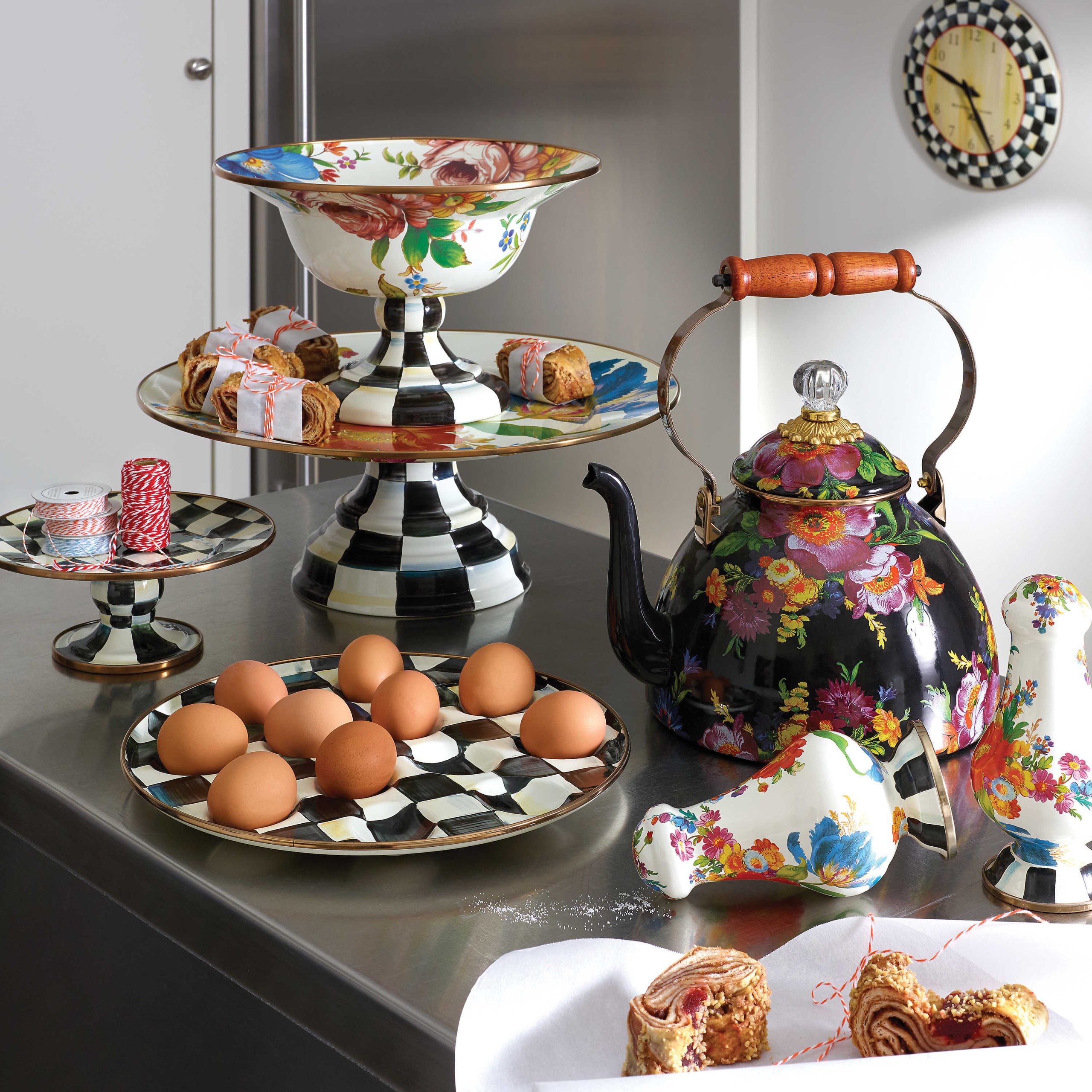 Efsanevi emaye çaydanlıklarımız ile şıklığınızı tamamlayın.  MacKenzie-Childs stiliyle taşan muhteşem Black Flower Market 3 Quart Çaydanlığımız, su ısıtıcısını kaynatmak için ocağa koymak için yeni nedenler bulmanızı sağlayacak. Ağır çelik alt gövde, yemyeşil bahçe renkleriyle sırlanmış, süslü botanik çıkartmalarla elle dekore edilmiş ve bronz paslanmaz çelikle çerçevelenmiştir. Ahşap sap ve cam üstlü kapak. Taze kesilmiş çiçekler veya yeşilliklerle de muhteşem bir şekilde doldurulmuş.